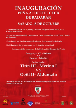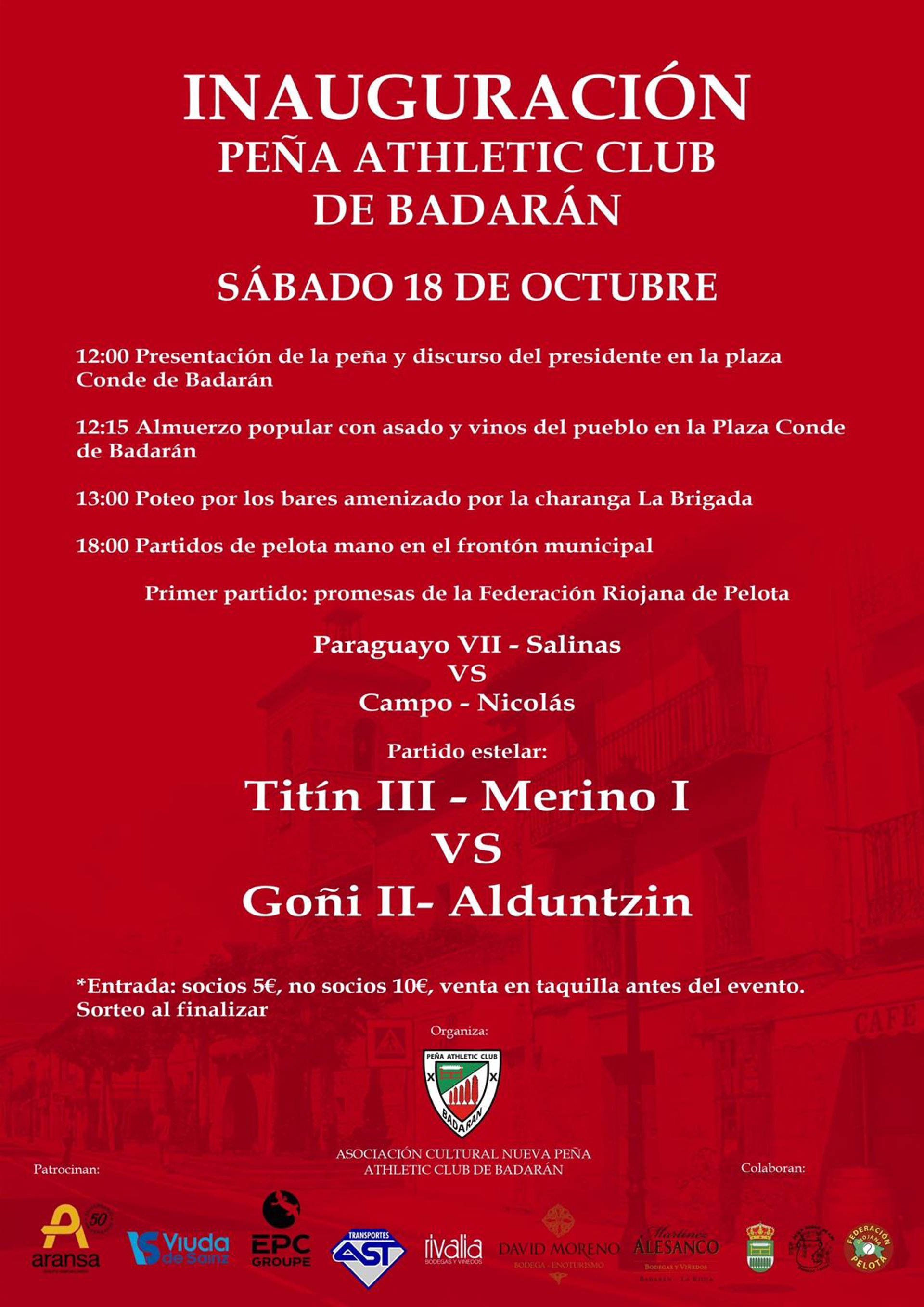 Este sábado 18 de octubre la peña Athletic Club de Badarán celebra su inauguración como peña oficial con diversos actos que se desarrollarán durante toda la jornada, entre los que destaca el partido de pelota que enfrentará a Titín III y Merino I contra Goñi II y Alduntzin en el frontón municipal de la localidad.