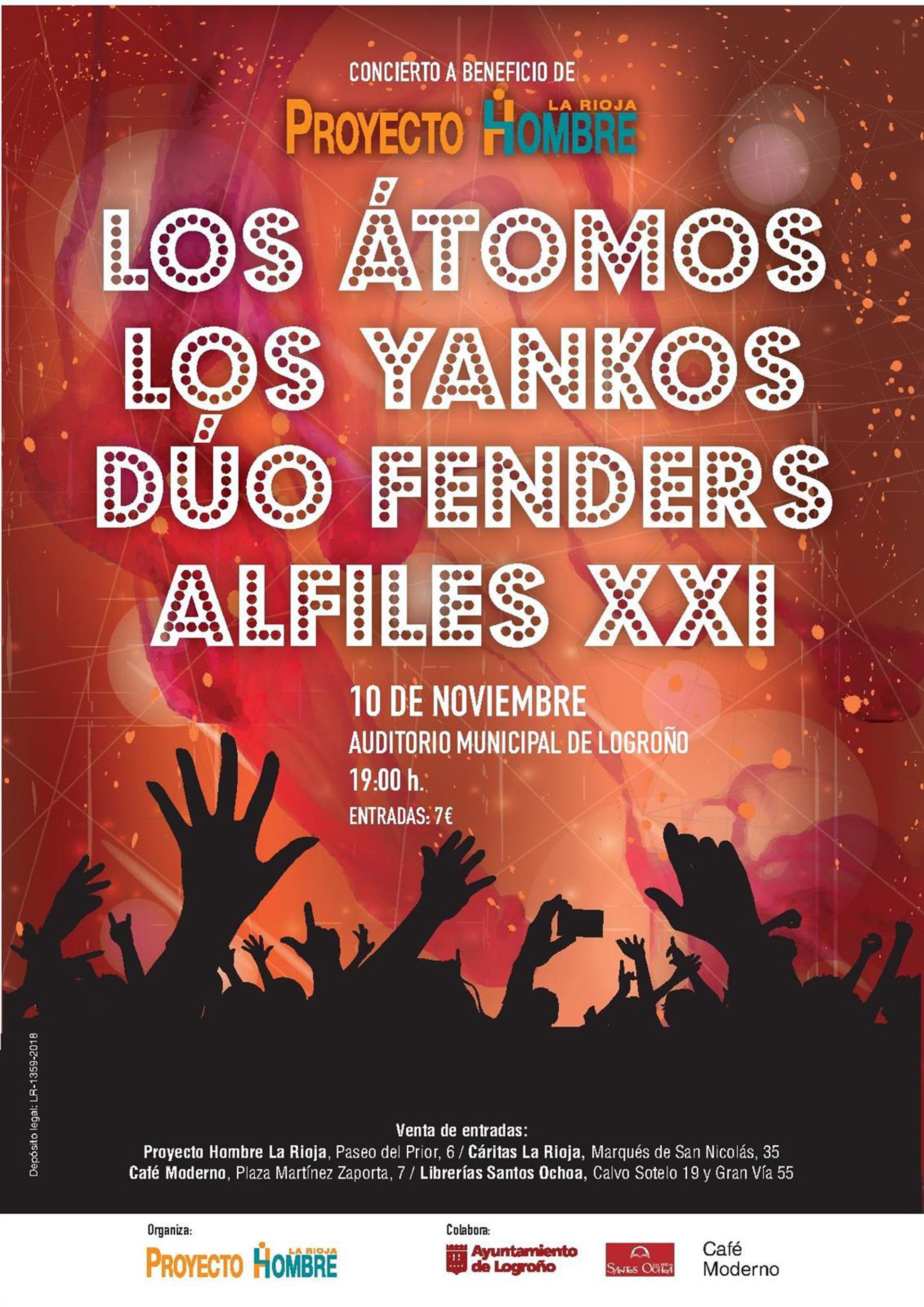 Los Átomos, Los Yankos, el Dúo Fenders y Alfiles XXI actuarán en el Auditorio del Ayuntamiento de Logroño el próximo día 10 de noviembre en el tradicional concierto a beneficio de Proyecto Hombre La Rioja. Las entradas se pueden adquirir desde este jueves, por un precio de 7 euros, en la sede de Proyecto Hombre, Cáritas, Café Moderno y Librerías Santos Ochoa.