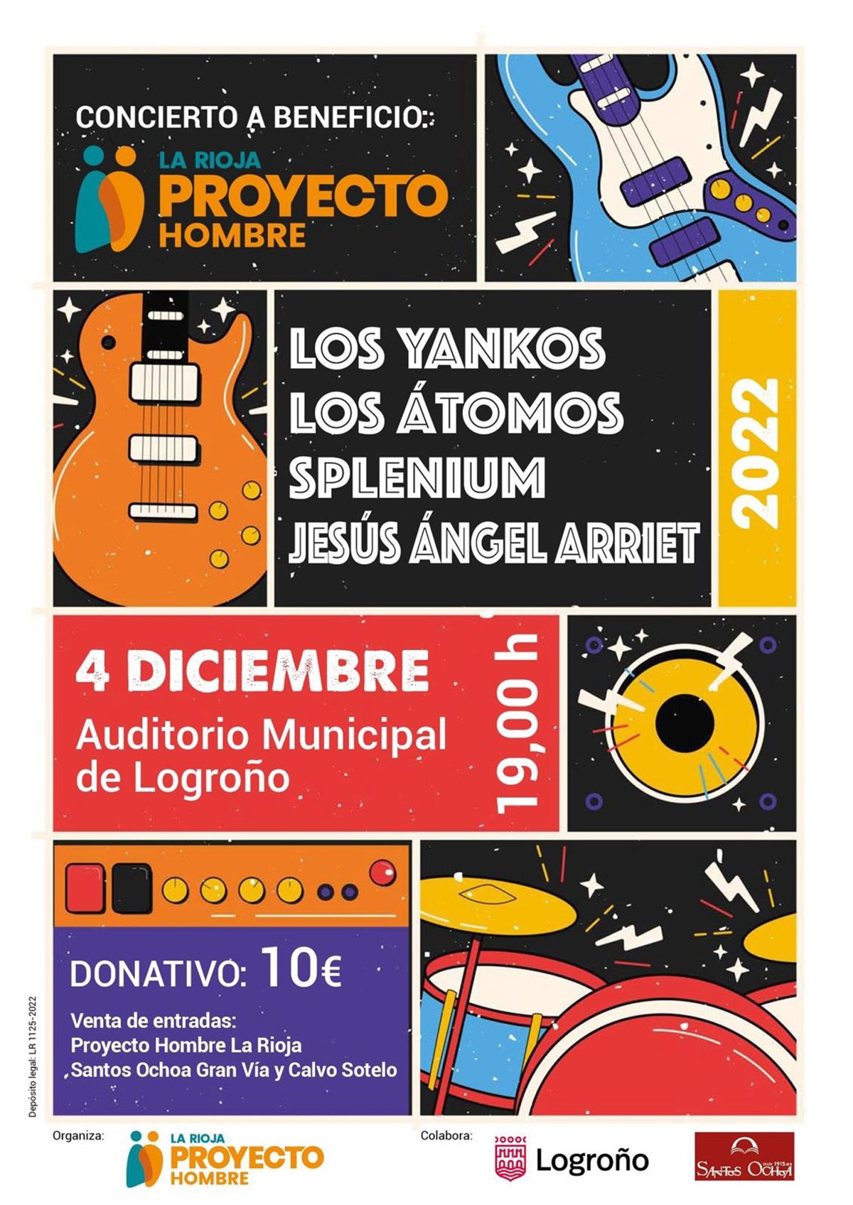 El Auditorio del Ayuntamiento de Logroño acogerá el 4 de diciembre, a las 19 horas, otra edición del concierto anual solidario a beneficio del Proyecto Hombre de La Rioja en el que participarán los grupos Los Yankos, Los Átomos y Splenium, y con la intervención del humorista Jesús Ángel Arriet, quien ofrecerá un monólogo y ejercerá también de presentador.
