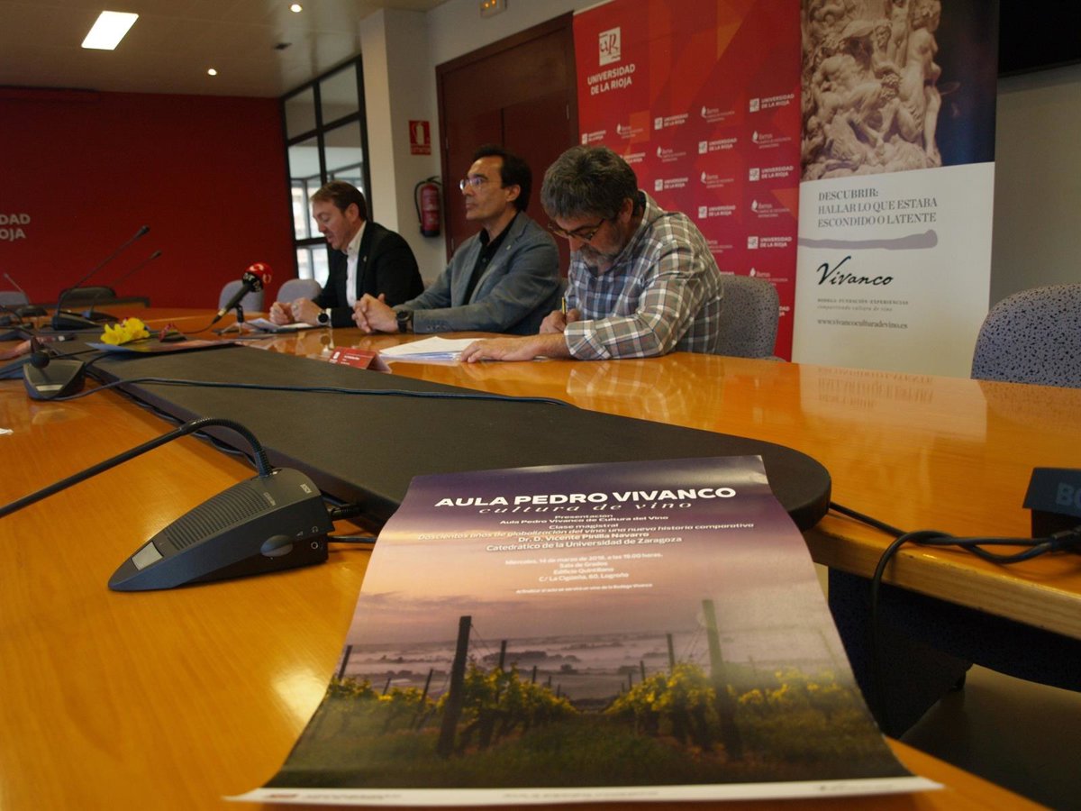 El plan de actividades para 2018 ha sido presentado por Javier García Turza, secretario general de la Universidad de La Rioja, Santiago Vivanco, presidente de la Fundación Vivanco, y Emilio Barco, responsable del Aula Pedro Vivanco Cultura del Vino.