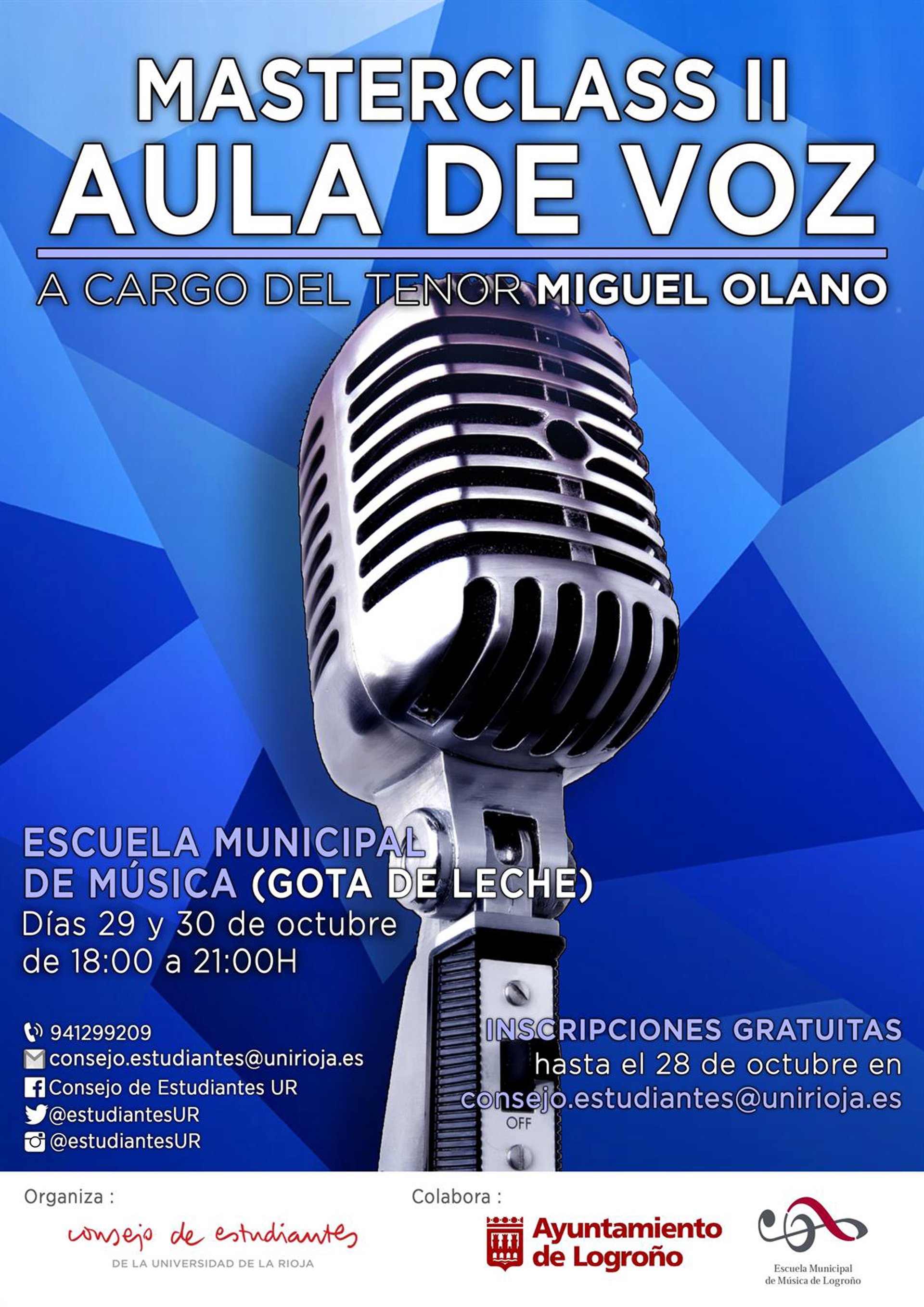 La Masterclass de Canto 'Aula de Voz', puesta en marcha el pasado mes de junio por el Consejo de Estudiantes y el Ayuntamiento de Logroño, celebrará su segunda edición los días 29 y 30 de octubre, en la Escuela Municipal de Música de La Gota de Leche, contando con la master class del tenor Miguel Olano.