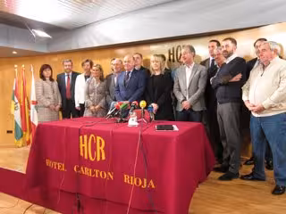 Junto al presidente de la FER se presentan Emilio Reina (Perfum Packaging); Juan Ignacio Fernández (Rioja Fuentes Energías Renovables); Yolanda Salazar (Eurocolor Lacados); Santiago Frías (Bodegas Riojanas); Lino Martínez (Hijo de Martínez Somalo); Jesús Jiménez (Arcomalia); Julia García (García Hermanos Nicolas); Fernando Cortezón (Escala); Santiago San Román (Construcciones Cruz San Román); Melchor Elguea (Elguea Construcciones); y Liborio Sevilla (Victoria).