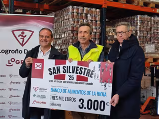 El presidente de Logroño Deporte, Francisco Iglesias, y Ernesto Navarrete, director institucional de Caja Rural de Navarra, entidad patrocinadora de la prueba, han realizado la entrega de un cheque por valor de 3.000 euros al vicepresidente del Banco de Alimentos de La Rioja, José Manuel Pascual Salcedo, recaudados en la XLI San Silvestre de Logroño, Memorial Tomás Mingot.