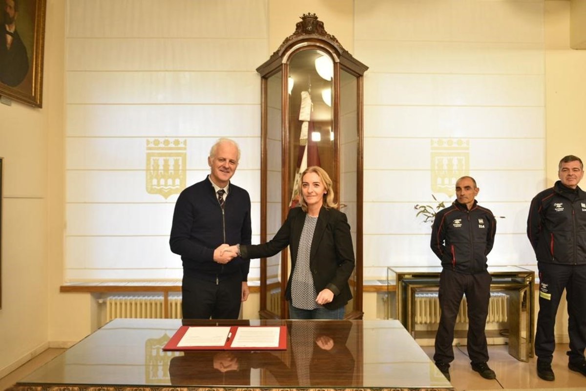 El alcalde de Logroño, Pablo Hermoso de Mendoza, y la consejera de Salud, María Somalo, han firmado esta mañana el convenio de colaboración entre el Ayuntamiento y el Gobierno regional para la prestación del servicio contra incendios y salvamentos fuera del término municipal de Logroño. El acuerdo tiene un importe de 625.000 euros en el año 2022 y de 650.000 euros en el año 2023.