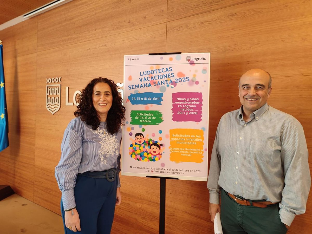La concejala de Infancia y Educación, Laura Rivas, junto al responsable de Juventud, Alberto Martínez, ha presentado el programa de ludotecas en vacaciones de Semana Santa en el que se ofrecen 572 plazas dirigidas a niñas y niños empadronados en Logroño, nacidos entre el 2013 y el 2020 (el año pasado se amplió el rango de edad hasta los 12 años) y cuyo plazo de inscripción se abre el viernes 14 de febrero.
