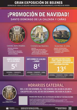 En concreto, los visitantes podrán elegir entre tres opciones de visita. La primera permitirá explorar la iglesia, el claustro y la exposición de belenes de la Catedral de Santo Domingo de la Calzada, con una entrada de 5 euros para adultos y 3 euros para niños de entre 3 y 13 años. La segunda opción abarca los tres monumentos, sumando el Monasterio de Cañas con una entrada general de 8 euros y 4 euros para los más pequeños. Y la tercera opción, ofrece una visita guiada nocturna que incluye la torre y el claustro de la Catedral, el Convento de San Francisco, y el Monasterio de Cañas. Los precios para esta última experiencia son de 13 euros para adultos y 7 euros para niños de 3 a 12 años.