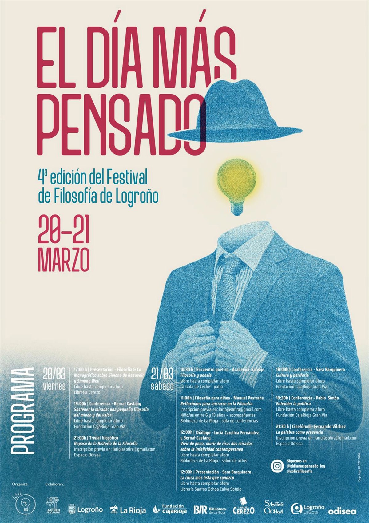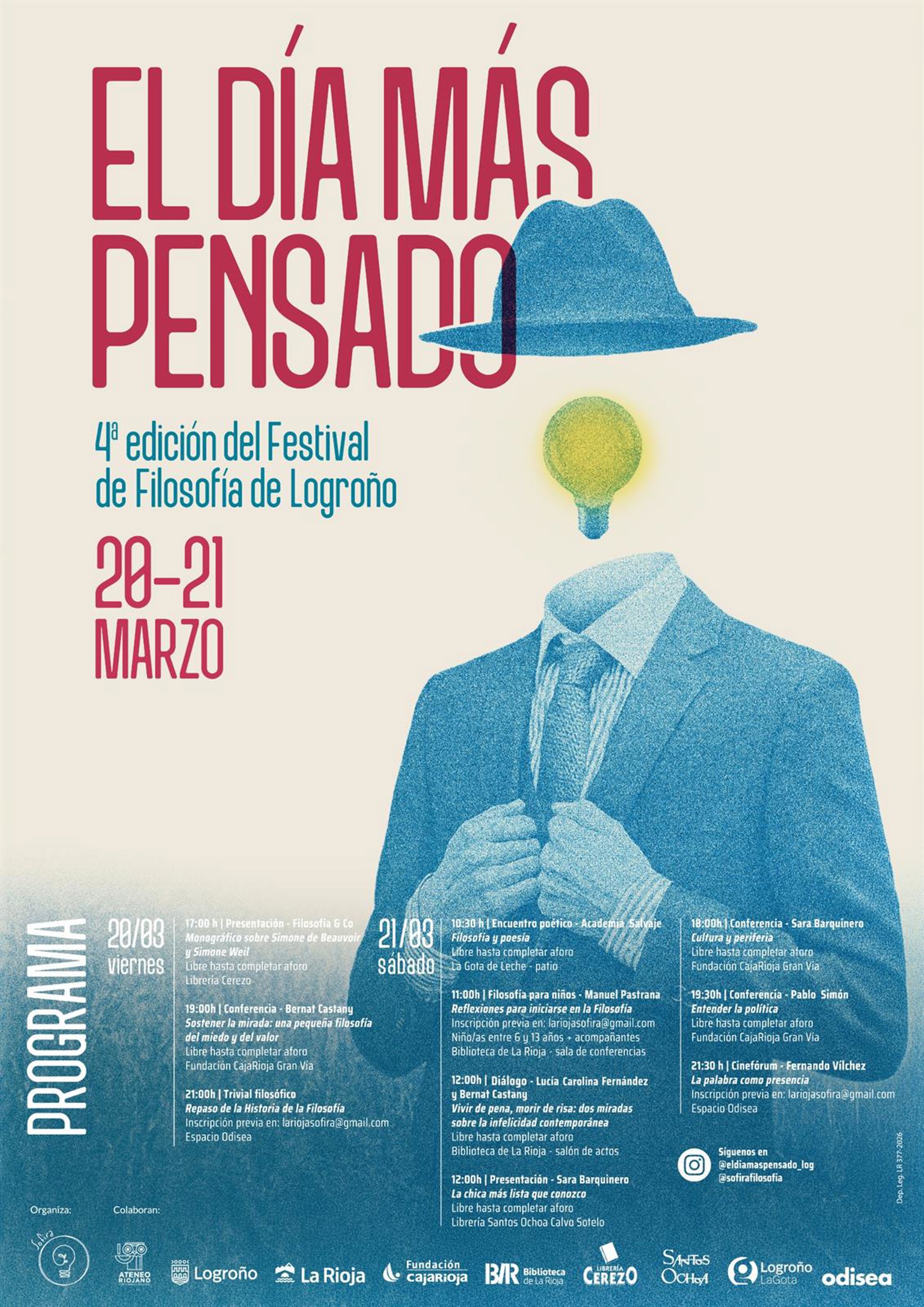 La jornada del sábado 21 de marzo reunirá varias actividades en el marco del festival de filosofía de Logroño 'El día más pensado', organizado por la Sociedad de Filosofía de La Rioja (SOFIRA). A las 11 horas se celebrará la charla 'Reflexiones para iniciarse en la Filosofía', dirigida a niños de entre 6 y 13 años acompañados de adultos, y a las 12 horas tendrá lugar el diálogo 'Vivir de pena, morir de risa: dos miradas sobre la infelicidad contemporánea', con entrada libre hasta completar aforo que requiere inscripción previa.