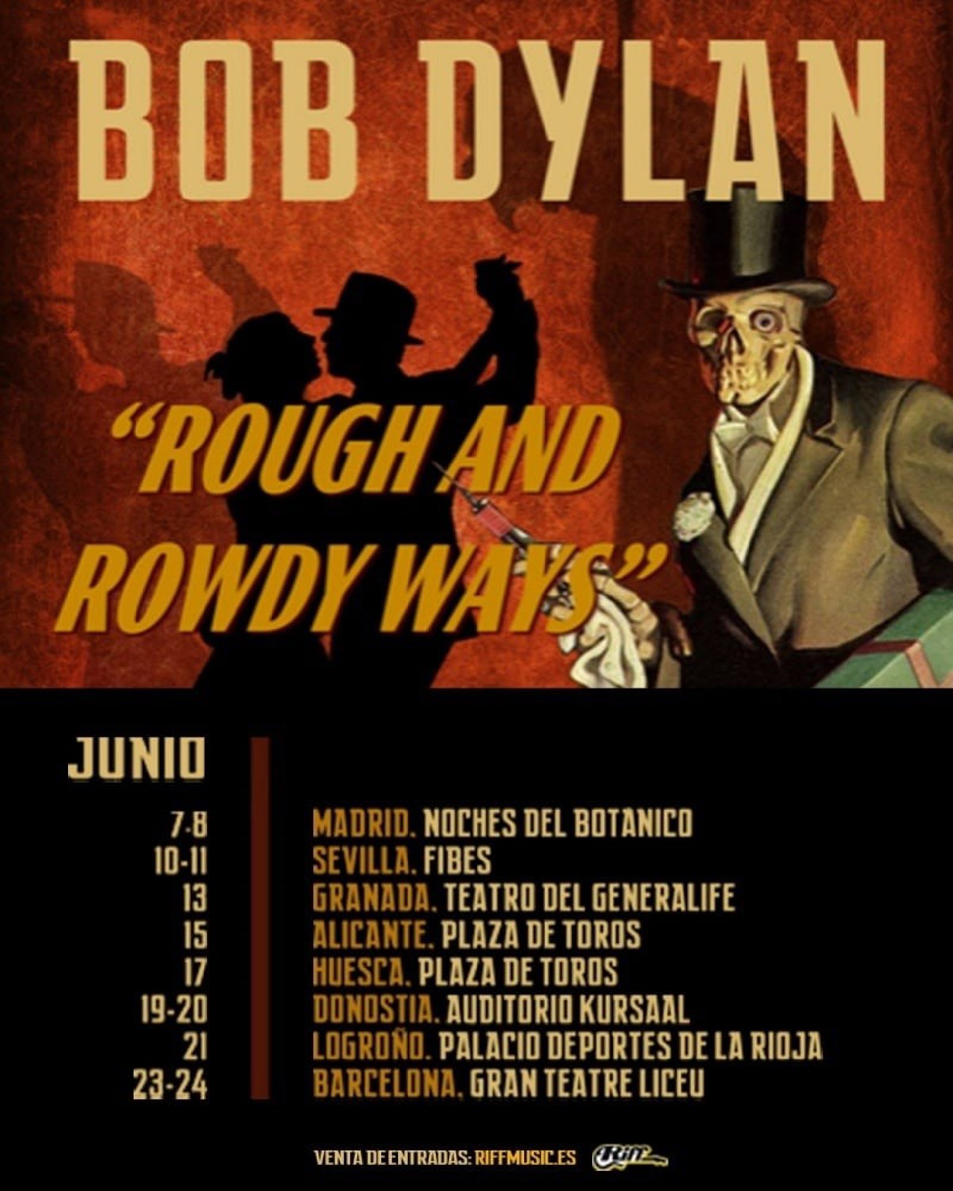 En concreto, Dylan estará previamente en Madrid los días 7 y 8 de junio; después recalará en Sevilla el 11 y 12 de junio para, posteriormente, continuar la gira el día 13 en Granada; el 15 de junio en Alicante; el día 17 en Huesca; 18 y 19 de junio en Donostia; el día 21 en Logroño y, por último, los días 23 y 24 en Barcelona.