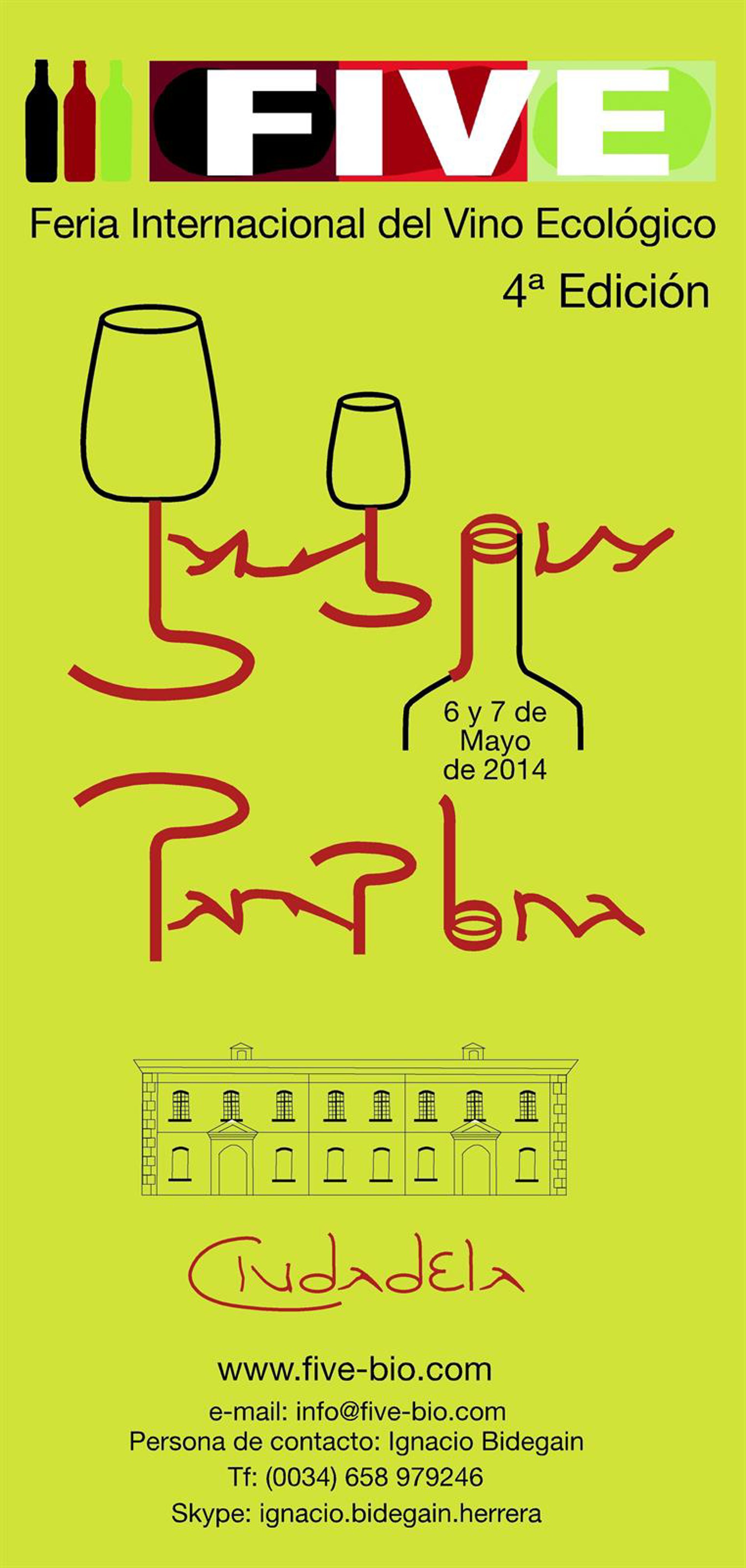 La 4ª edición de FIVE será los días 6 y 7 de mayo en Pamplona en la Ciudadela. Por la tarde de la segunda jornada habrá una cata degustación de vinos ecológicos abierta al público donde el cocinero pamplonés Iñaki Andradas hablará de su libro "22 maneras de poner el vino en tu mesa" y hará una demostración de cómo cocinar algunas tapas elaboradas con vino ecológico. También se podrán comprar in situ por primera vez algunas de las botellas expuestas.