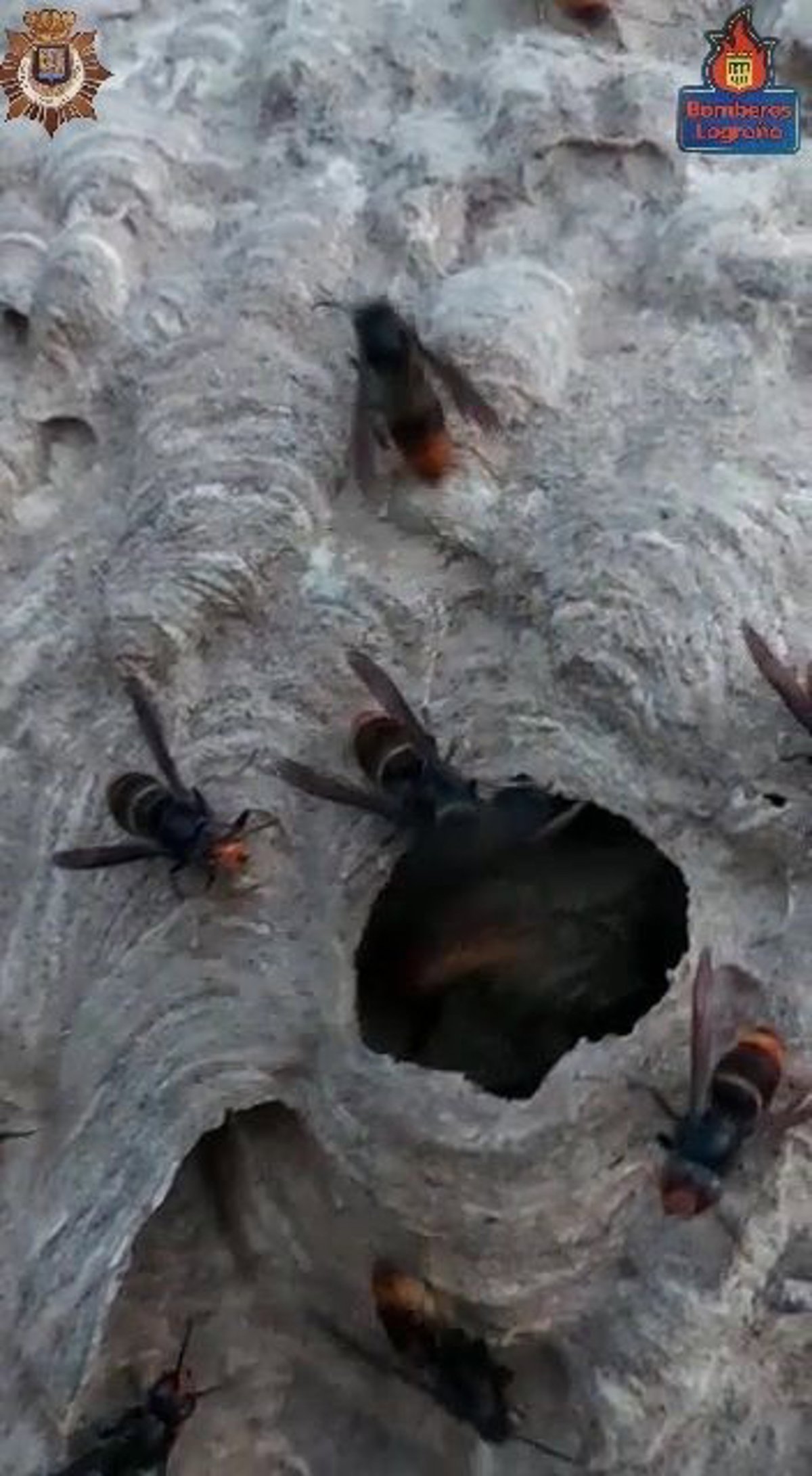 Bomberos de Logroño y Policía Local han intervenido para eliminar un nido de avispa asiática de gran tamaño situado en la copa de un árbol en el Parque del Ebro. El tamaño del nido era de 90 centímetros de diámetro y estaba a unos 15 metros del suelo.