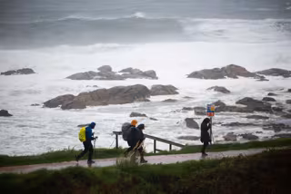 Archivo - Varios peregrinos realizan el Camino de Santiago, a pesar del temporal, en la zona de Santa Maria de Oia hasta Cabo Silleiro, a 20 de octubre de 2022, en Pontevedra, Galicia, (España). La borrasca Armand es la primera de gran impacto de la tem - Gustavo de la Paz - Europa Press - Archivo