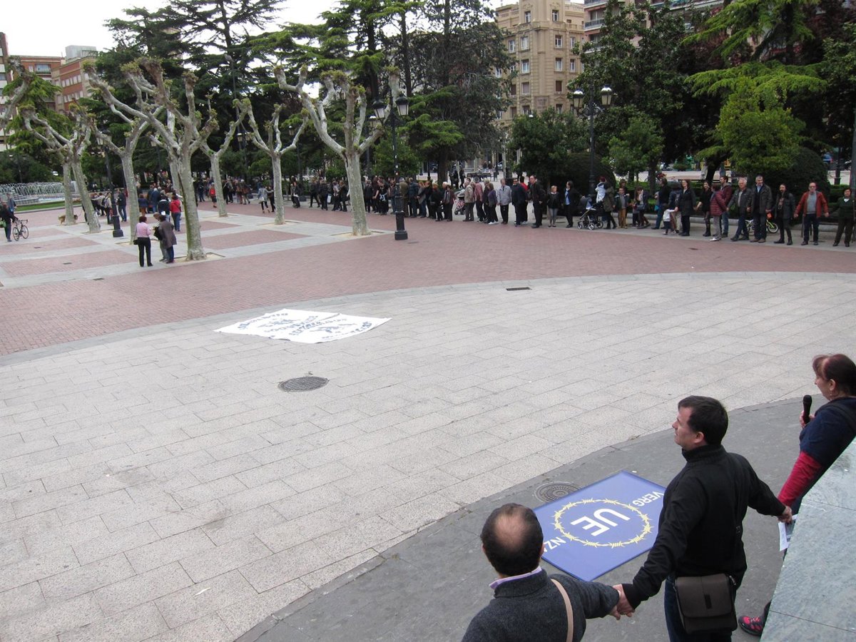 Una cadena humana, realizada en el Paseo del Espolón de Logroño, ha servido para que la Plataforma #BienvenidosRefugiados La Rioja, que ha convocado la acción, critique la solución que está dando la Unión Europea al problema de los refugiados, sobretodo tras el acuerdo con Turquía, así como para decir que la celebración - este 9 de mayo- del 'Día de Europa' es más un "Día de Luto", como ha señalado un portavoz de la plataforma, José Manuel Calzada.