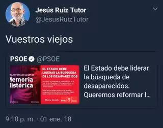 Así lo demuestran sus últimos tuits sobre la Memoria Histórica, en los que se refiere de "forma despectiva" a "vuestros viejos" y "cuestiona su necesidad democrática al relativizar su utilidad respecto a la búsqueda de desaparecidos dando por superado todo lo que aún queda por hacer".