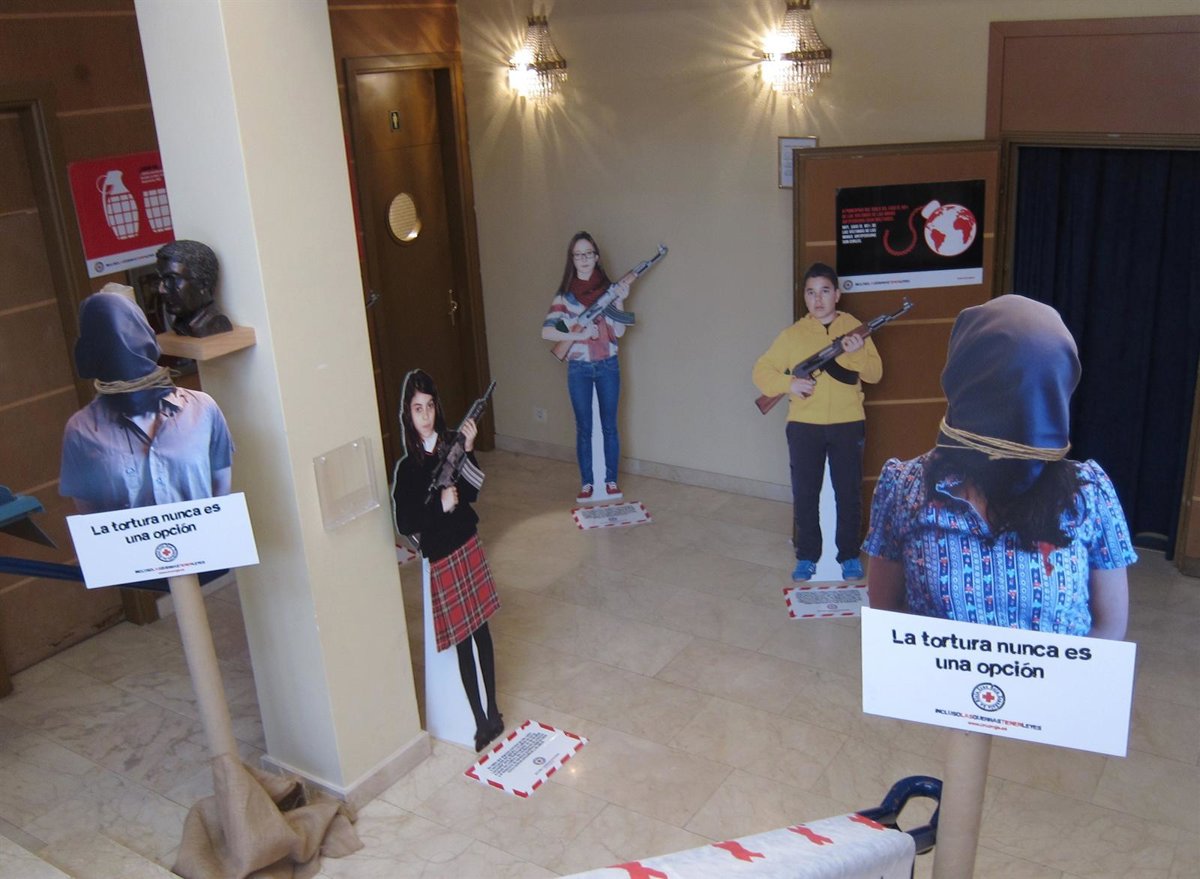 Además, en la exposición hay un juego de la rayuela "con un maniquí con una pierna amputada", símbolo de las minas antipersona, y una serie de siluetas también de encapuchados atados a postes "que nos vienen a significar que la tortura nunca es una opción".