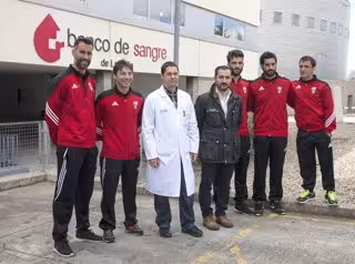 El director técnico del Centro de Transfusión de La Rioja, Carlos Sola, ha recibido este jueves, en el Hospital San Pedro, a los jugadores del primer equipo de la Unión Deportiva Logroñés (UDL) en la visita que han realizado a las instalaciones del Banco de Sangre, donde han comprobado las labores y procesos por los que pasa la sangre desde el momento de la donación hasta que está preparada para ser transfundida. Algunos de ellos han donado sangre, concretamente el fisioterapeuta y el capitán de la UDL, Miguel Martínez.