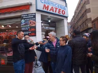 Allí se han sucedido las esperables escenas de felicidad entre vecinos que llevan muy repartido el premio. Según nos ha contado Sergio Calvo, uno de los carniceros. Calvo asegura haber vendido alrededor de 10.000 euros en participaciones de cinco euros sin recargo y también en décimos. Esto equivale a unos 25 millones de euros en premios sobre una cantidad total distribuida desde San Adrián y que podría ascender a 83 millones de euros.
