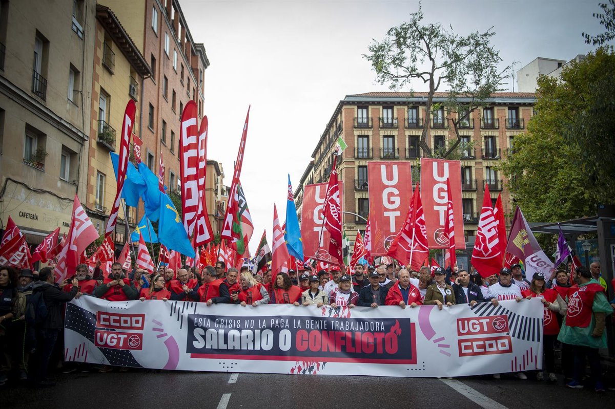 CCOO y UGT han reunido este jueves a más de 50.000 personas en Madrid, según los datos de la organización, para exigir a la patronal una subida de los sueldos de acuerdo al incremento de la inflación, bajo el lema 'Esta crisis no la paga la clase trabajadora. Salario o conflicto'.