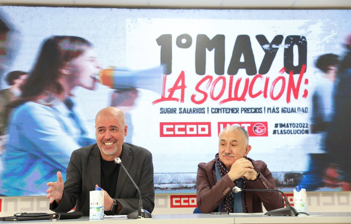 Los secretarios generales de CCOO y UGT, Unai Sordo (i) y Pepe Álvarez (d), ofrecen una rueda de prensa con motivo de la celebración del Primero de Mayo, Día Internacional del Trabajo, en la sede de CCOO, a 25 de abril de 2022, en Madrid (España). Este - Marta Fernández Jara - Europa Press