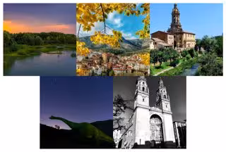 Son imágenes que combinan ribera, valle y ciudad: los sotos del Ebro en Alfaro al atardecer; Arnedillo enmarcado por hojas doradas en el valle del Cidacos; la iglesia barroca a orillas del Tirón en Cuzcurrita del Río Tirón; una figura de dinosaurio en Enciso bajo un cielo de circumpolares en el Alto Cidacos; y la concatedral de Santa María de La Redonda en Logroño, con juegos de luz y sombra en la plaza.