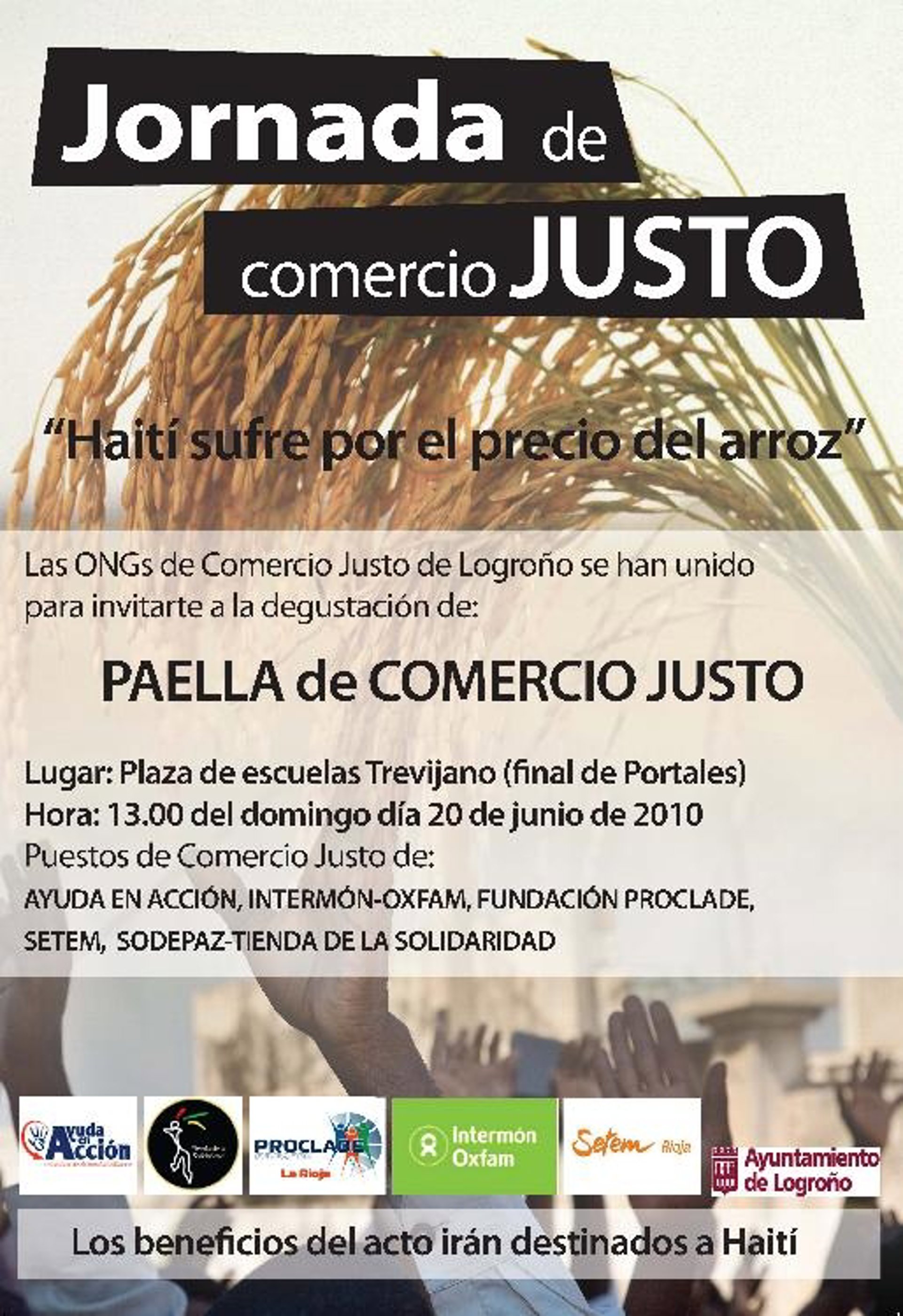 Varias organizaciones que trabajan en Logroño por el Comercio Justo organizan conjuntamente una degustación de paella el domingo, 20 de junio, a las 13 h. en la plaza de las escuelas Trevijano con el tema: 'Haití sufre por el precio del arroz'.