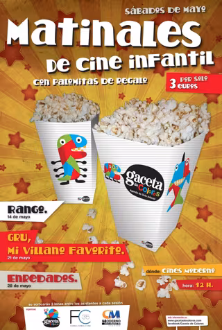 Gaceta de Colores, Film Commission 35 y Cines Moderno presentan 'Matinales de cine infantil', un ciclo de tres películas dirigidas al público infantil que se proyectarán los tres últimos sábados de mayo. Los títulos seleccionados son 'Rango', el 14 de mayo; 'Gru, mi villano favorito', el 21 de mayo; y 'Enredados', el 28 de mayo.