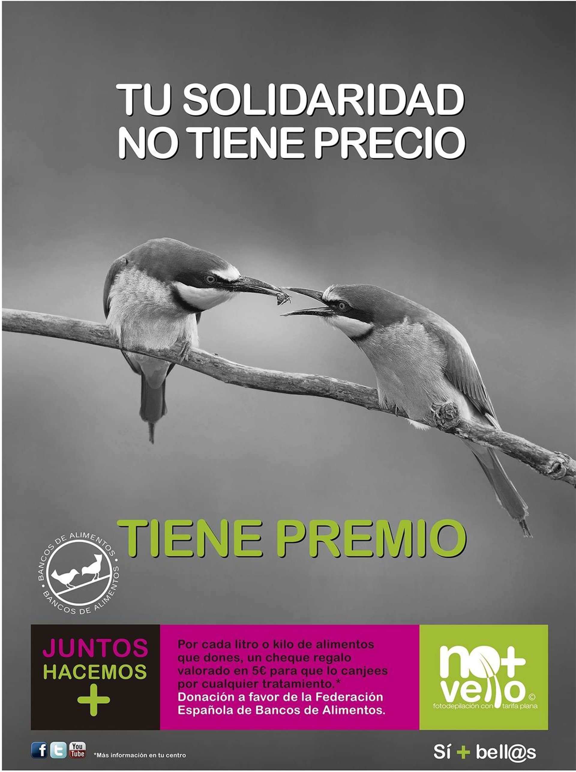 El centro de fotodepilación y tratamientos estéticos 'No+Vello' desarrollará, desde hoy y hasta el 31 de octubre, una campaña por la que sus clientes conseguirán cheques descuento a cambio de alimentos, no perecederos, que irán destinados al Banco de Alimentos.