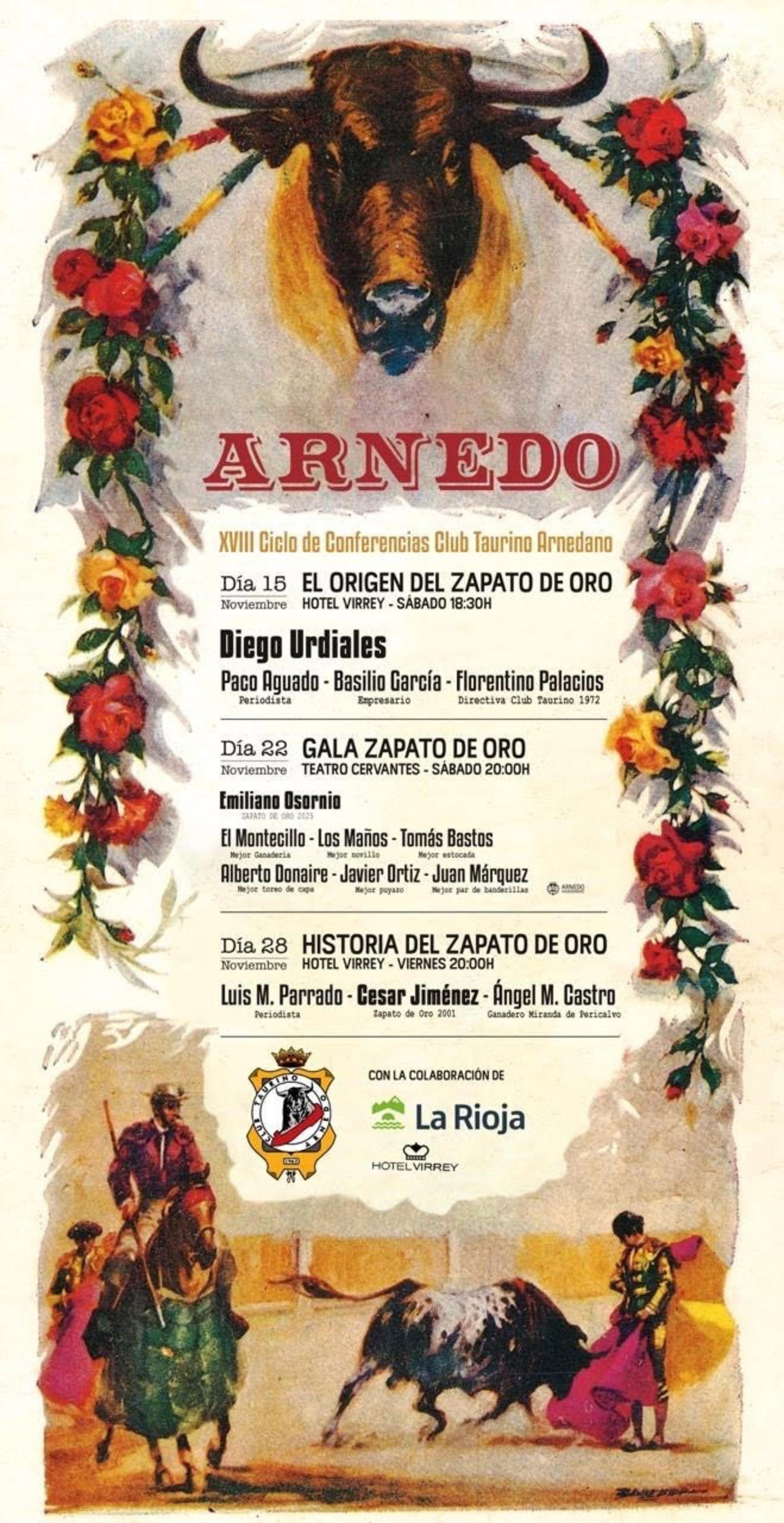El XVIII Ciclo de Conferencias Taurinas comenzará el 15 de noviembre a las 18,30 horas en el Hotel Virrey con la mesa redonda titulada 'El origen del Zapato de Oro', en la que intervendrán el matador Diego Urdiales, el periodista taurino Paco Aguado, el empresario del calzado Basilio García y Florentino Palacios, miembro de la directiva del Club Taurino en 1972, año en el que se instituyó el trofeo.