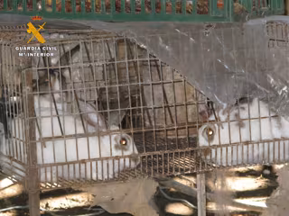 Salvo los perros -dos de ellos enfermos- que se encontraban sueltos en una parte de la parcela entre abundantes excrementos, restos óseos, comida putrefacta, etc, el resto de animales se hallaron enjaulados entre abundante inmundicia, el hurón en un carro de la compra y los demás en habitáculos de pequeñas dimensiones fabricados con palets y mallazo.