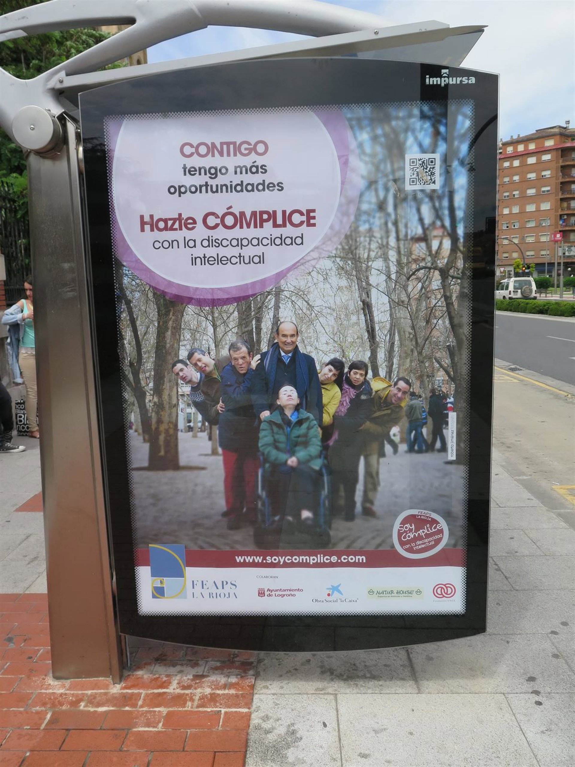 Varias marquesinas y señales de las calles de Logroño recuerdan el llamamiento de FEAPS La Rioja (Federación Riojana de organizaciones en favor de las Personas con Discapacidad Intelectual) para contar con "cómplices", con colaboradores, que ayuden a mostrar y ofrecer más oportunidades y una vida mejor a las personas con discapacidad intelectual.