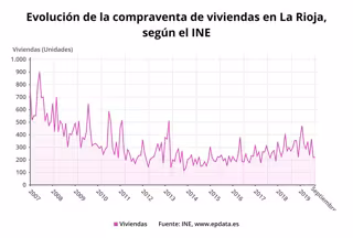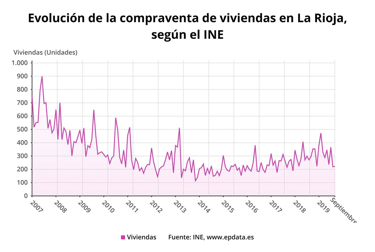 La compraventa de viviendas bajó un 25,2% en septiembre en La Rioja en relación con el mismo mes de 2018, hasta sumar 220 operaciones, según los datos que publica este martes el Instituto Nacional de Estadística (INE), más del doble que la caída media (12%) y la segunda mayor de todas las comunidades.
