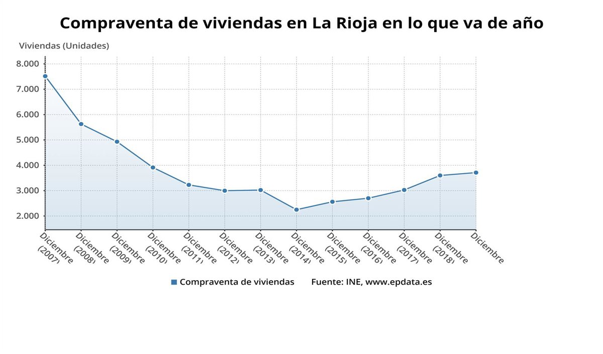 Por su parte, la compraventa de viviendas en La Rioja en diciembre de 2019 cayó un 2,2% respecto al mismo mes del año anterior, hasta las 218 operaciones, uno de los retrocesos más moderados de entre todas las comunidades, que de media registraron un incremento del 1,8%.