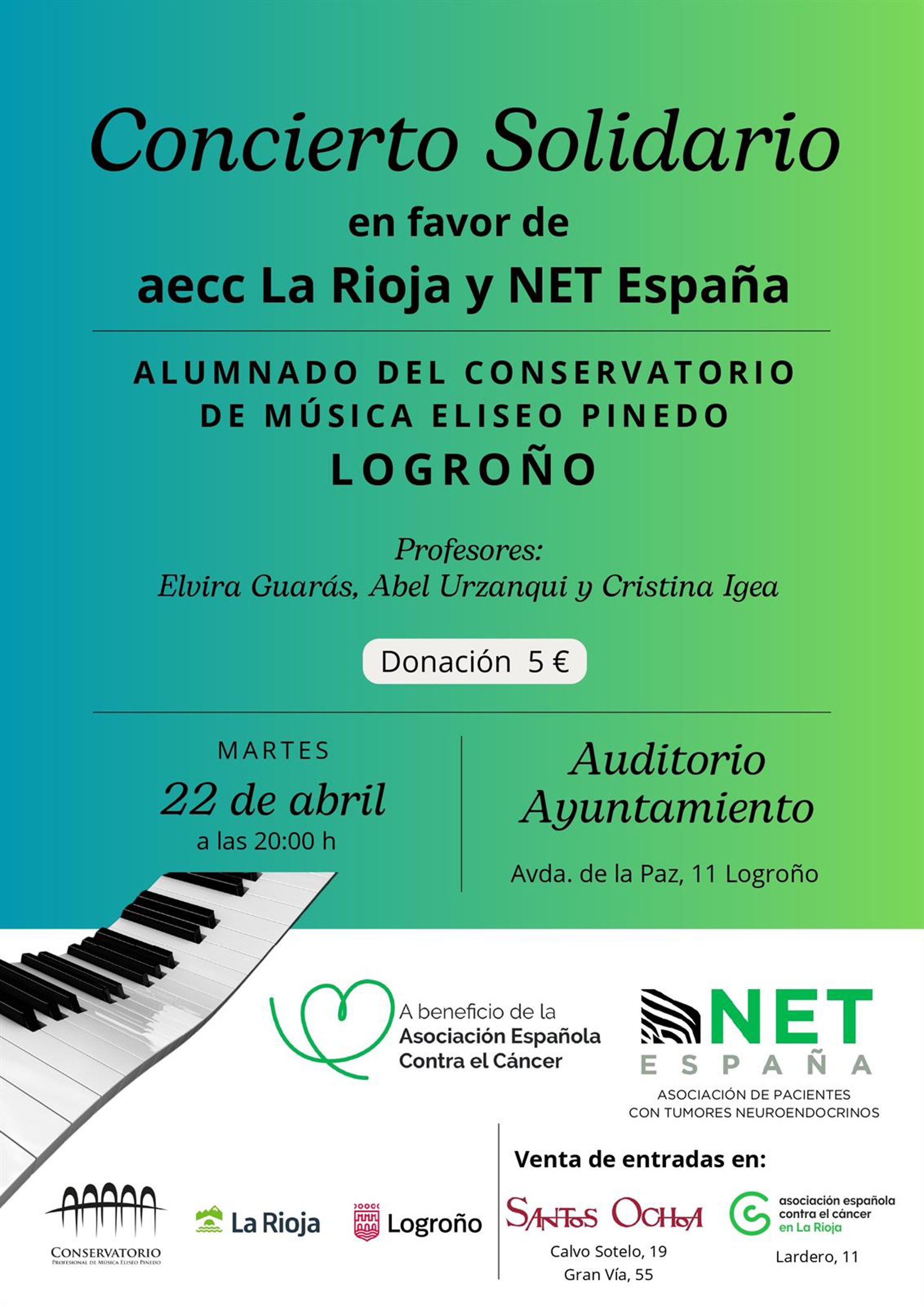 El Auditorio del Ayuntamiento de Logroño acogerá el martes 22 de abril, a las 20,00 horas, el Concierto Solidario organizado por el Conservatorio Profesional de Música Eliseo Pinedo. La recaudación se destinará a los proyectos sociales y de investigación que promueven la Asociación Española Contra el Cáncer de La Rioja y NET-España, la asociación de pacientes con tumores neuroendocrinos.