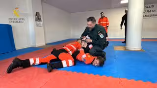 Autocontrol en situaciones de riesgo que puedan derivar en una agresión a personal sanitario. Técnicas de sueltas en agarres. Control y derribo. Desplazamientos y caídas. Trabajo en equipo. Uso de torniquete bajo estrés Conocimiento APP "ALERCOPS".