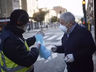 Un agente de la Policía Nacional reparte una mascarilla a un hombre en Pamplona/Navarra (España) a 15 de abril de 2020. - Eduardo Sanz - Europa Press