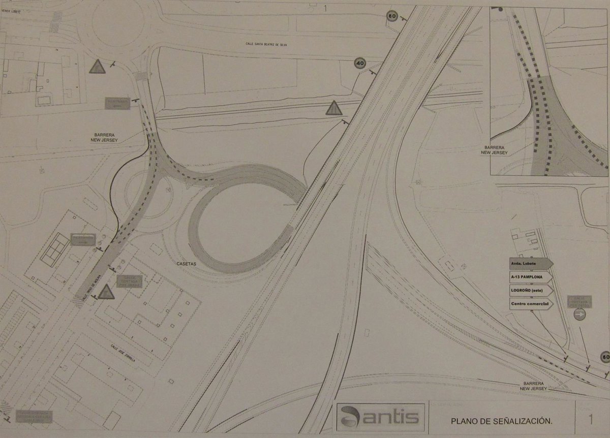 La glorieta contará con un diámetro interno de 36 metros y dos carriles de 4,5 y 5,5 metros. Conectará con el vial de la LO-20 viniendo desde los polígonos de Cantabria y Las Cañas o desde Viana al centro de la ciudad por el este.
