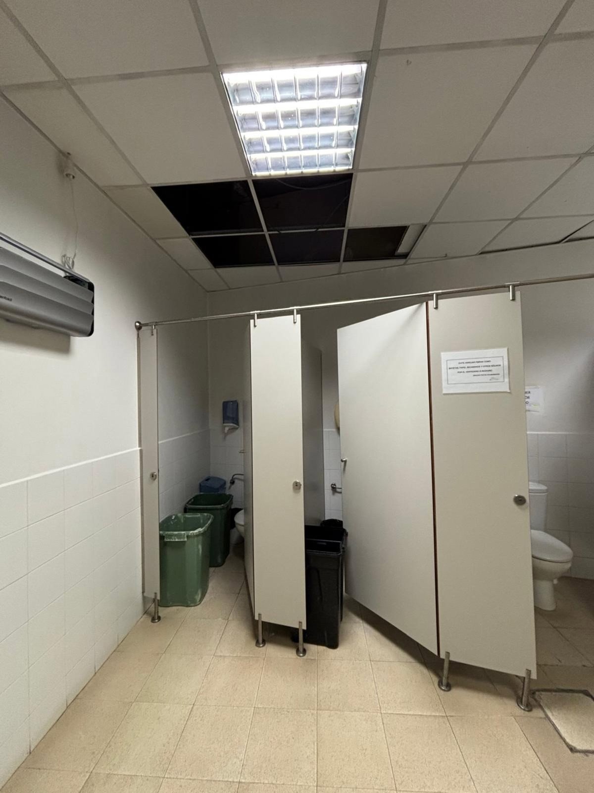 En estas instalaciones donde se cambia el personal para ponerse los uniformes de trabajo, "las placas de los techos se caen, dejando colgando cables y por donde se forman verdaderas cascadas de agua cuando llueve, con la peligrosidad de que los profesionales sufran caídas al estar el suelo totalmente resbaladizo".