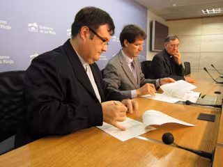 El consejero de Educación, Cultura y Turismo, Gonzalo Capellán, y el ecónomo de la Diócesis de Calahorra y La Calzada-Logroño, Alberto Díez Pereira, han firmado esta mañana el convenio de colaboración para financiar la segunda fase de restauración del retablo mayor de la iglesia de Santa María la Mayor de Ezcaray, que data del siglo XVI (1510). También ha estado presente el responsable de Patrimonio, Pablo Díaz Bodegas.