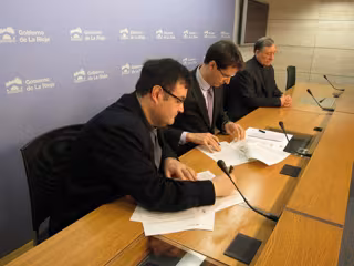 El consejero de Educación, Cultura y Turismo, Gonzalo Capellán, y el ecónomo de la Diócesis de Calahorra y La Calzada-Logroño, Alberto Díez, han suscrito esta mañana un convenio de colaboración por el que se financiarán parte de las obras de restauración del Retablo Mayor de la iglesia parroquial de San Martín en Albelda. También ha comparecido el responsable de Patrimonio de la Diócesis, Pablo Díaz Bodegas.