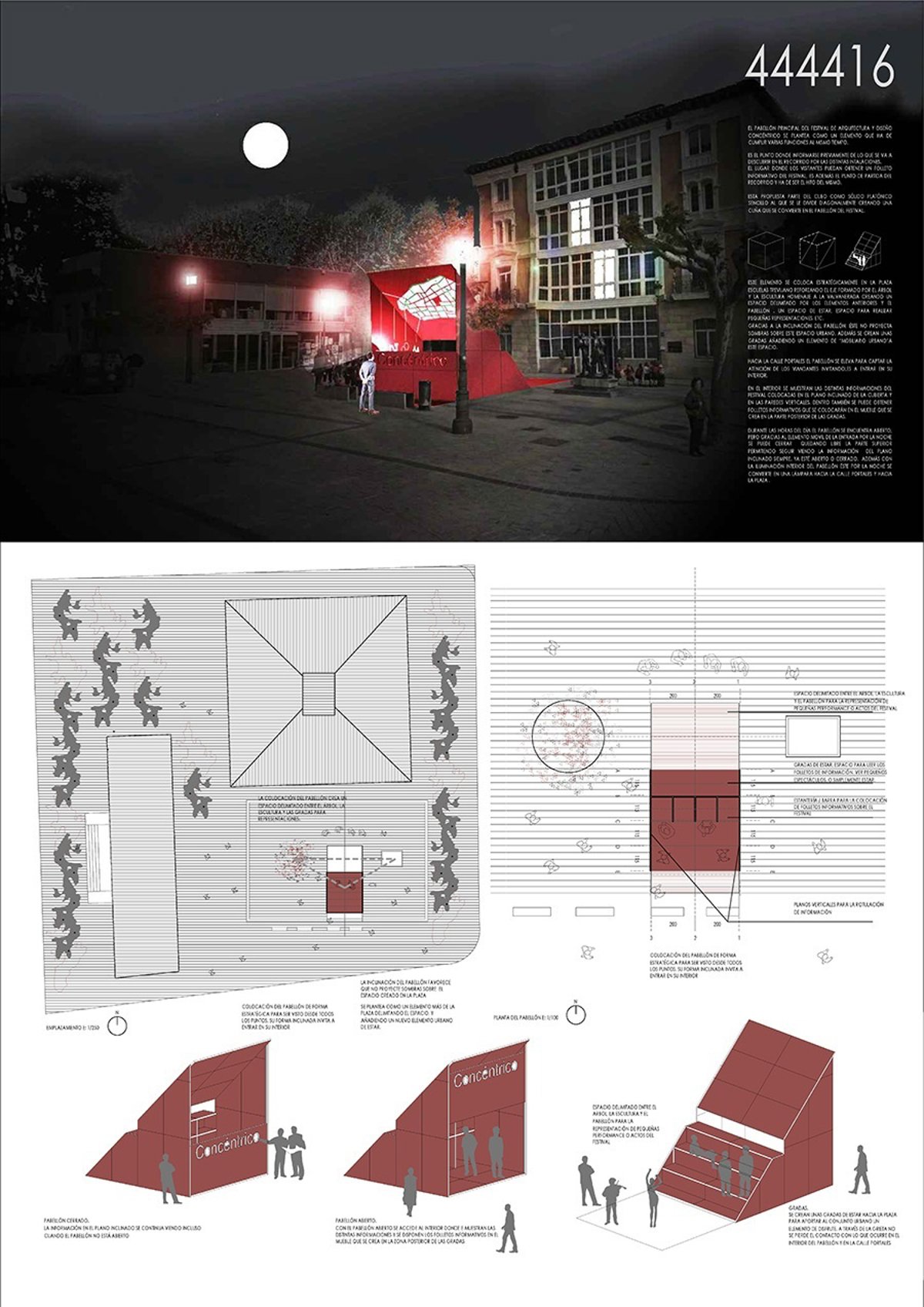 La propuesta ganadora, 'Cuña Urbana', del arquitecto alfareño David Bergasa, parte de la figura de un cubo al que se ha dividido diagonalmente creando una cuña y una grada que se convierten en el pabellón principal e hito del festival.