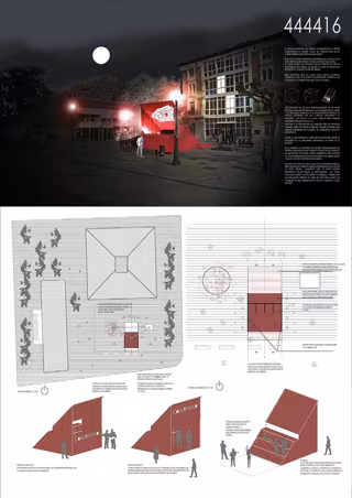 En el interior se mostrarán las distintas informaciones del festival tanto en las paredes verticales como en el plano inclinado de la cubierta. Este plano será siempre visible, incluso cuando el pabellón está cerrado gracias al elemento móvil de la entrada. Por la noche el pabellón se convertirá en una lámpara hacia la calle Portales y hacia la Plaza.