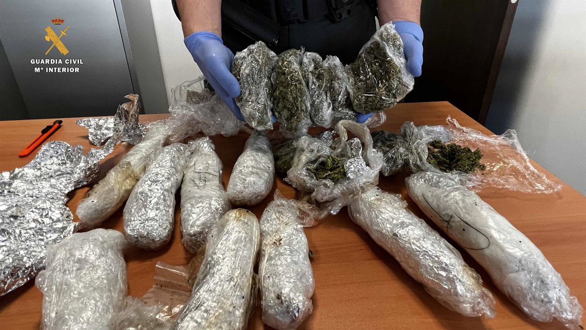 En el registro del vehículo los agentes hallaron en el hueco de la rueda de repuesto un paquete de gran tamaño revestido y forrado con varias capas de plástico, conteniendo su interior 385 gramos de marihuana, distribuidos en otros diez paquetes pequeños para su inmediata salida al mercado ilícito.