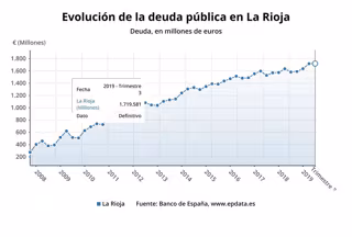 La deuda pública de La Rioja se ha incrementado en el último trimestre en 2,2 millones de euros, un 0,13% más y se sitúa en los 1.719,58 millones, lo que supone el 20,1 por ciento del PIB, una disminución del 0,1 por ciento, según los datos publicados este viernes por el Banco de España.
