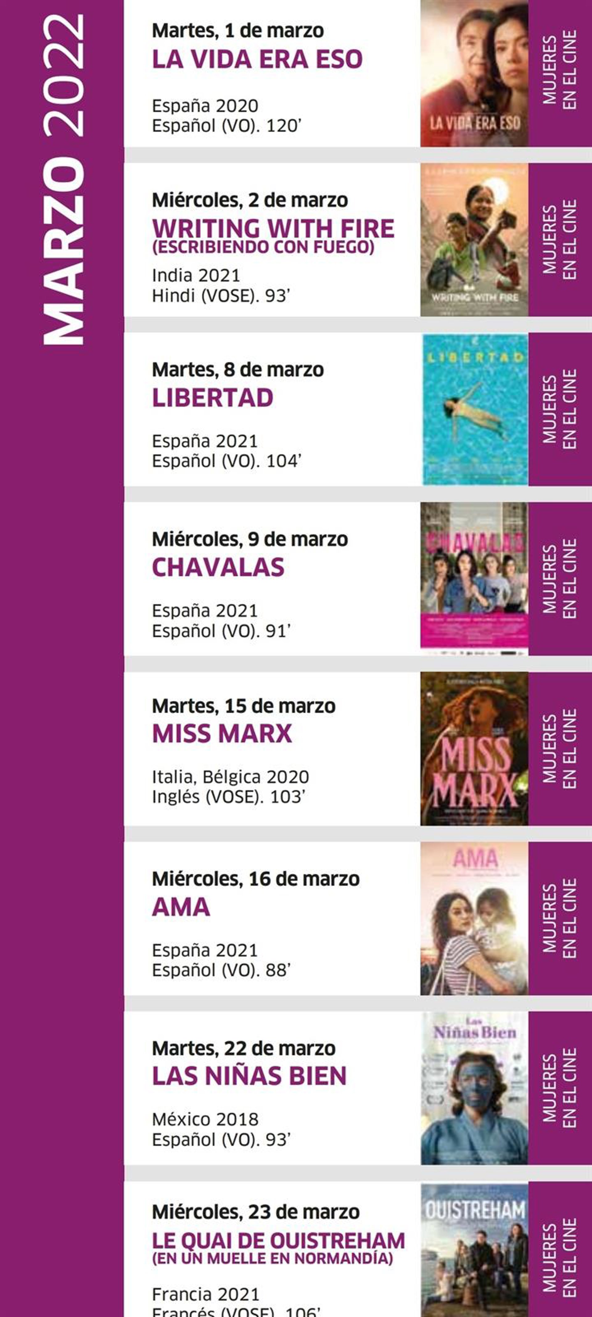 Un total de diez películas integran una programación variada, versátil y con diferentes procedencias, dentro de la concreción temática en torno a la mujer. El programa arranca este próximo martes día 1 con 'La vida era eso', dirigida por David Martín de los Santos y que irrumpió en los Goya y en el Festival de Sevilla de 2021 por la actuación de Petra Martínez. Esta cinta será presentada por Silvia Lobo, productora y distribuidora de la cinta.