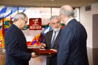 El director de la RAE, Darío Villanueva, ha mantenido un segundo encuentro institucional, esta vez en la sede del Consejo Regulador de la Denominación de Origen Calificada Rioja, con Fernando Salamero, presidente de DOCa Rioja y José Luis Lapuente, director general de la DOCa Rioja, donde ha aplaudido la naturaleza del nuevo mensaje mundial 'Saber Quién Eres', un concepto creativo en el que Rioja defiende sus raíces y que el mismo se plasma en español.