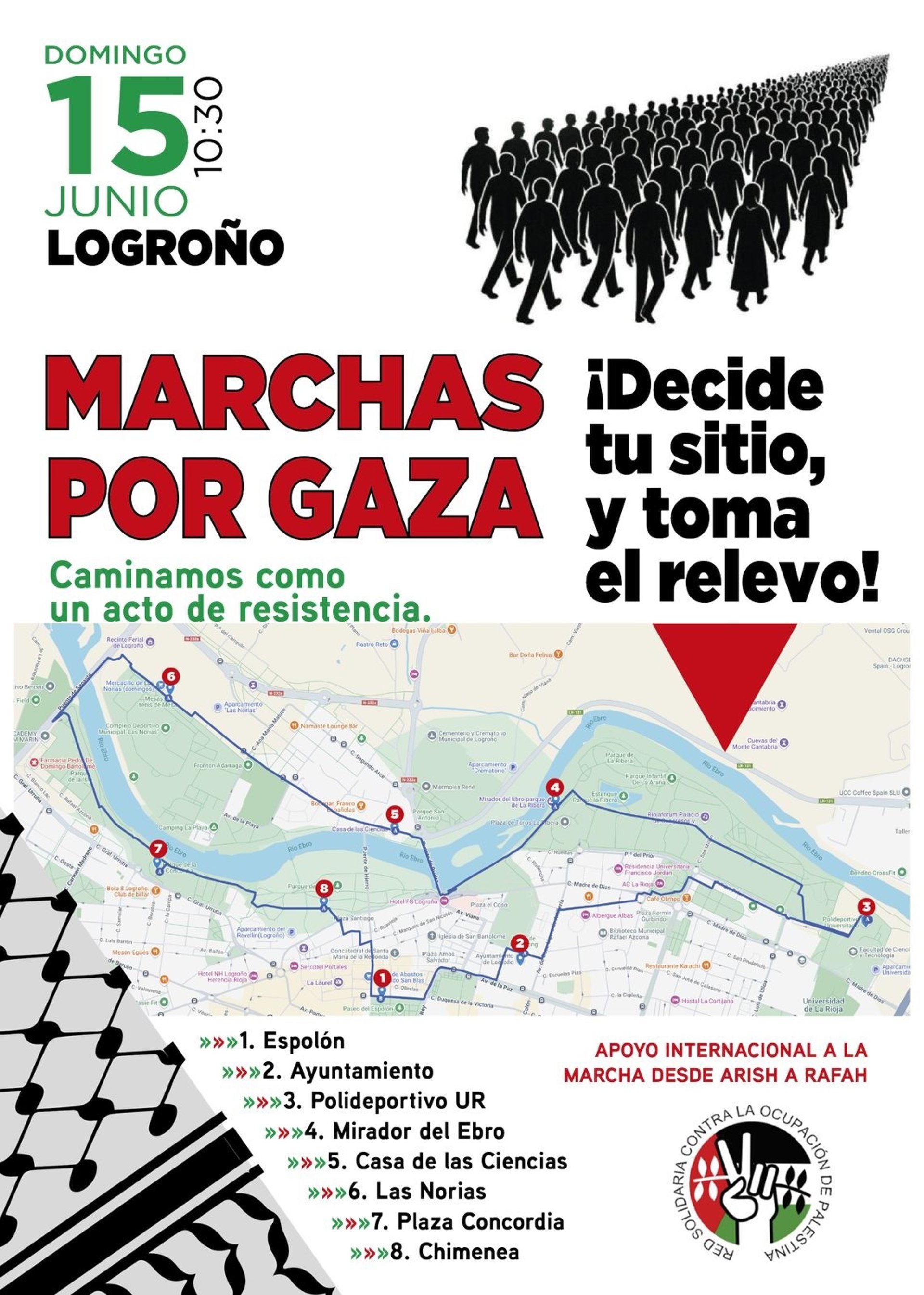 Respondiendo a un llamamiento de la coordinadora estatal RESCOP (Red Solidaria Contra la Ocupación de Palestina), este domingo 15 de junio de 2025 saldrá de la concentración permanente por Palestina del Espolón de Logroño una marcha de apoyo a la 'Marcha Global a Gaza'.