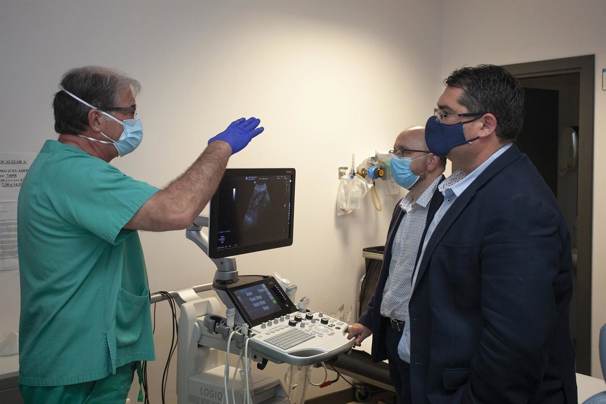 El director gerente de la Fundación Rioja Salud, Sergio Martínez, junto con el director gerente del SERIS, Alberto Lafuente, han visitado esta mañana las instalaciones del CARPA, donde está instalado el ecógrafo donado por la empresa Contourglobal La Rioja. Por sus novedosas características, este dispositivo de diagnóstico ha sustituido a otro ecógrafo que había previamente en las instalaciones.