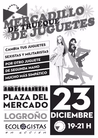 La asociación 'Ecologistas en Acción de La Rioja' ha organizado para este jueves, de las 19,00 hasta las 21,00 horas, en la plaza del Mercado de Logroño, un mercadillo de juguetes ecológicos, no sexistas y no militaristas. Durante el mismo, aquellas personas que lleven un juguete "tradicional", recibirán a cambio uno reciclado, no sexista ni militarista.
