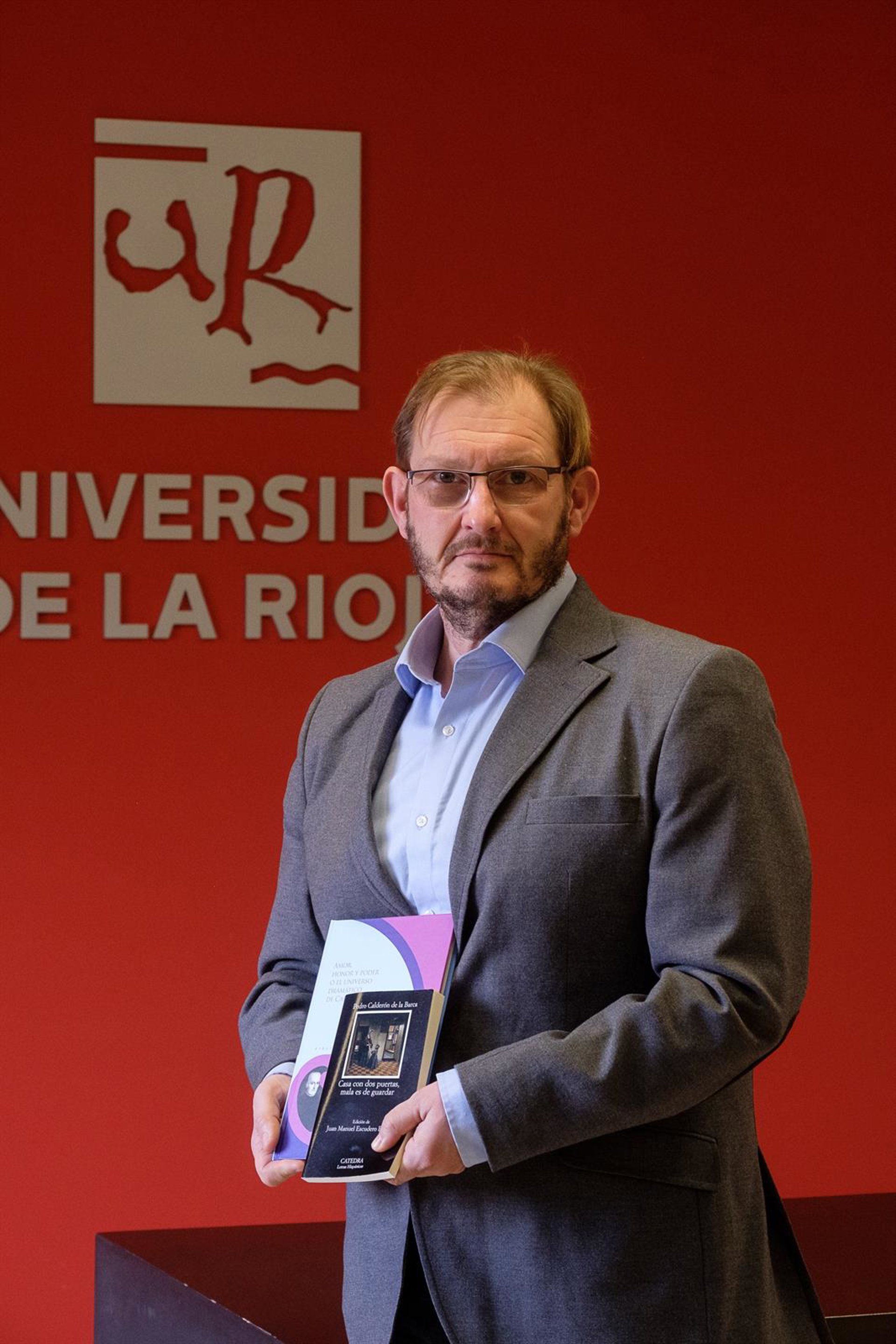 El profesor del departamento de Filologías Hispánica y Clásica de la Universidad de La Rioja, Juan Manuel Escudero Baztán, con sus libros sobre Calderón de la Barca - UNIVERSIDAD DE LA RIOJA
