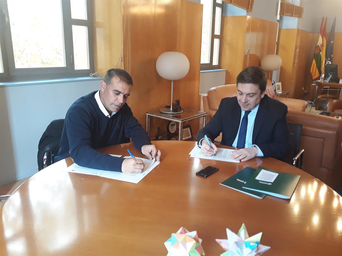 El consejero de Educación, Formación y Empleo, Alberto Galiana, y el alcalde de Fuenmayor, Alberto Peso, han firmado el convenio de colaboración para financiar los gastos derivados de las obras del nuevo centro docente.