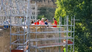 Por otro lado, se ha montado un sistema de andamio colgado en la pila 5 para actuar sobre las grietas detectadas tanto en el tajamar como en el espolón. Esta actuación comprende el rejuntado y llagueado de los bloques de piedra, su cosido y el rellenado interior para consolidar el bloque.